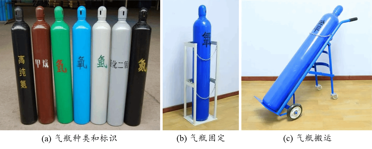 (3) 搬运气体钢瓶时,使用专用小推车,轻装轻卸,严禁敲击、碰撞气瓶,严禁使用气瓶做支架。