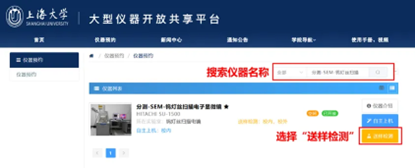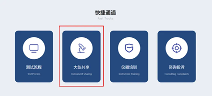 点击大型仪器开放共享平台首页上的【仪器预约】或【大仪共享】,进入仪器预约界面,搜索要预约的仪器名称【分测-仪器名称】。
